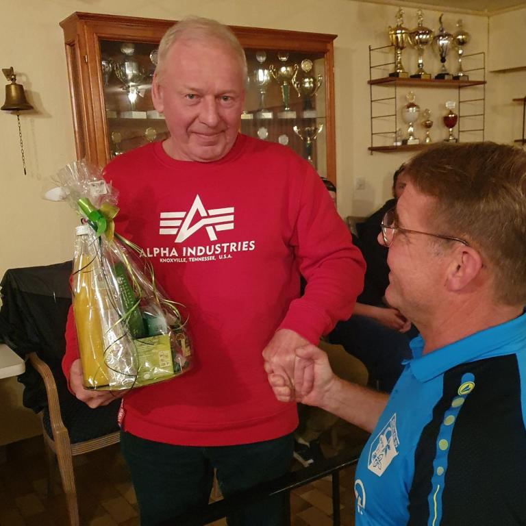Als besonderen Höhepunkt wurde dann noch der Ehrenpräsident Helmut Däubler nach vorne gerufen und mit einem eigenen Set bedacht. Er ist in der Runde als Fan und Zuschauer schon lange treu und bei den Alten Herren immer gern gesehen.